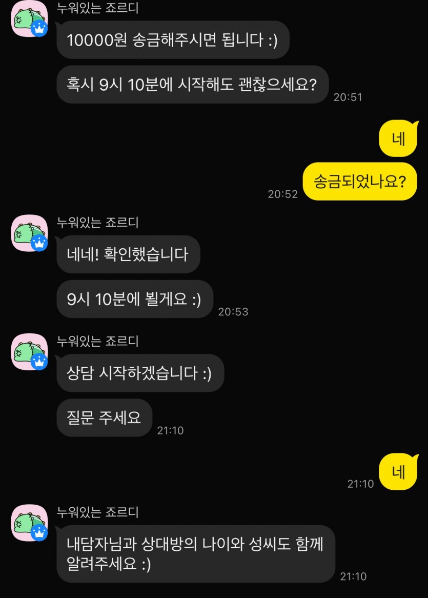 뭐 지금 그남자는 지친 상태이고 갈등하고있을거다 이런식으로 . 근데 2번쌤은 내가 말하지 않은 구체적인 부분을 맞추는게 너무 신기했어. 시간다되서 끝내려하는데 선생님이 상대방분은 혼자사시나요? 굳이 물어본거거든