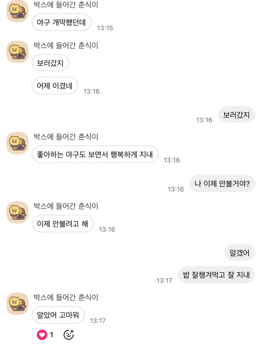 헤어진지 3주째이고 노컨하다가 갑자기 보고싶어서 밥 같이 먹자 했는데 저렇게 왔어… 더이상 답하기 뭐해서 좋아요만 냄겼어 대충 예상하긴했는데 막상 받으니 또 맘이 아프다ㅠㅠ