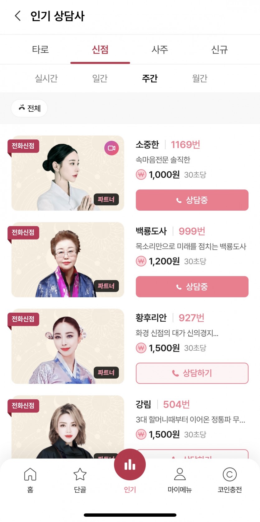 이번주 신점 인기쌤들 리스트인데